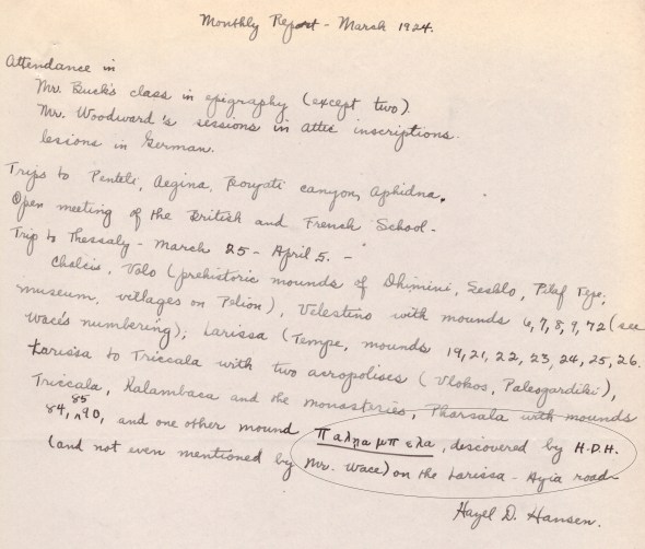 Hansen’s monthly report (March 1924) to the School’s Director, where she lists her trips, and also proudly claims that she discovered the prehistoric site of Μαγούλα Παλιάμπελα (“and not even mentioned by Mr. Wace”). ASCSA Archives, AdmRec 108/1, folder 5.