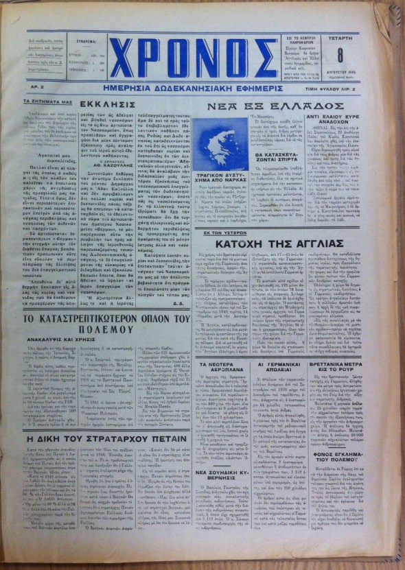 ΧΡΟΝΟΣ, Aug. 8, 1945. ASCSA Archives, Nicholas Mavris Papers.