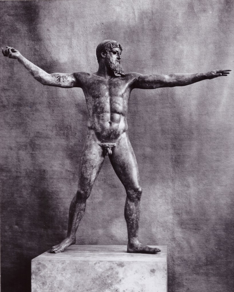 Two years before, in the same area, fishermen had caught in their nets the left arm of a bronze statue that was also transferred to the National Museum in Athens. That discovery did not, however, provoke any further archaeological exploration in the area, most likely for fiscal reasons. But then in September 1928, the local authorities in Istiaia, a town in northern Euboea, were informed of illicit activity in the sea near Artemision. Acting fast, they sailed to the spot and caught a fisherman’s boat filled with diving equipment. Not only that, its crew had already pulled out the right arm of a bronze statue. A few days later the authorities were able to bring up from the bottom of the sea a nearly complete male, larger than life, statue. The first photos showed the armless statue laying on its back on a layer of hay (Note how the area of the genitals has been conveniently darkened in the newspaper photos so that the public would not be offended by the nudity of the statue.)