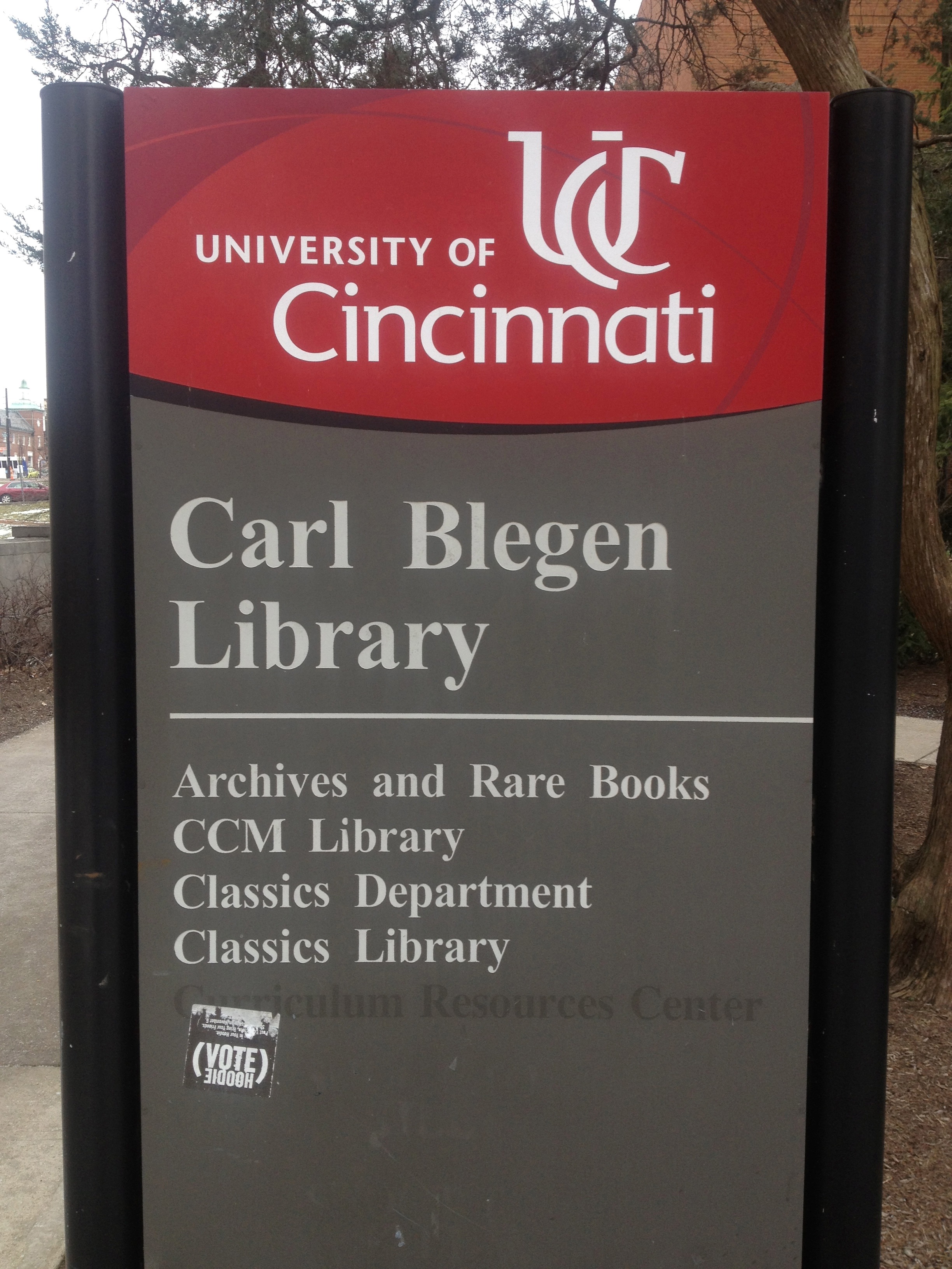 The spirit of Carl Blegen surrounds us. In 1972 I came to the University of Cincinnati to study Aegean Prehistory, the field that Blegen helped to create. (Curiously, Blegen himself objected to the term “prehistory” on the grounds that early humans had a history, preferring to call it “Preclassical archaeology”). I am the Carl W. Blegen Professor of Greek Archaeology at the University of Cincinnati. Our department is in Blegen Library. We use the Blegen Library of the American School of Classical Studies at Athens. But I never met Carl Blegen — and, in fact, until last May, when we discovered an old audio tape in a file cabinet at UC, I had never heard his voice.